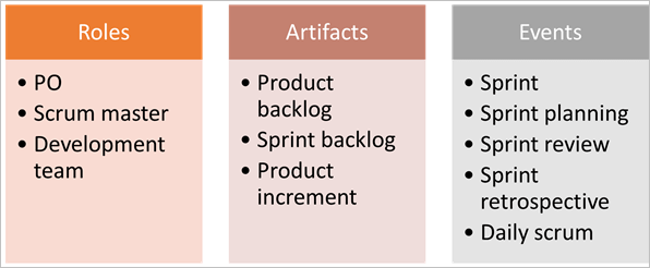 이벤트 : Sprint, Sprint 계획, Daily Scrum, Sprint 검토 및 Sprint 회고.